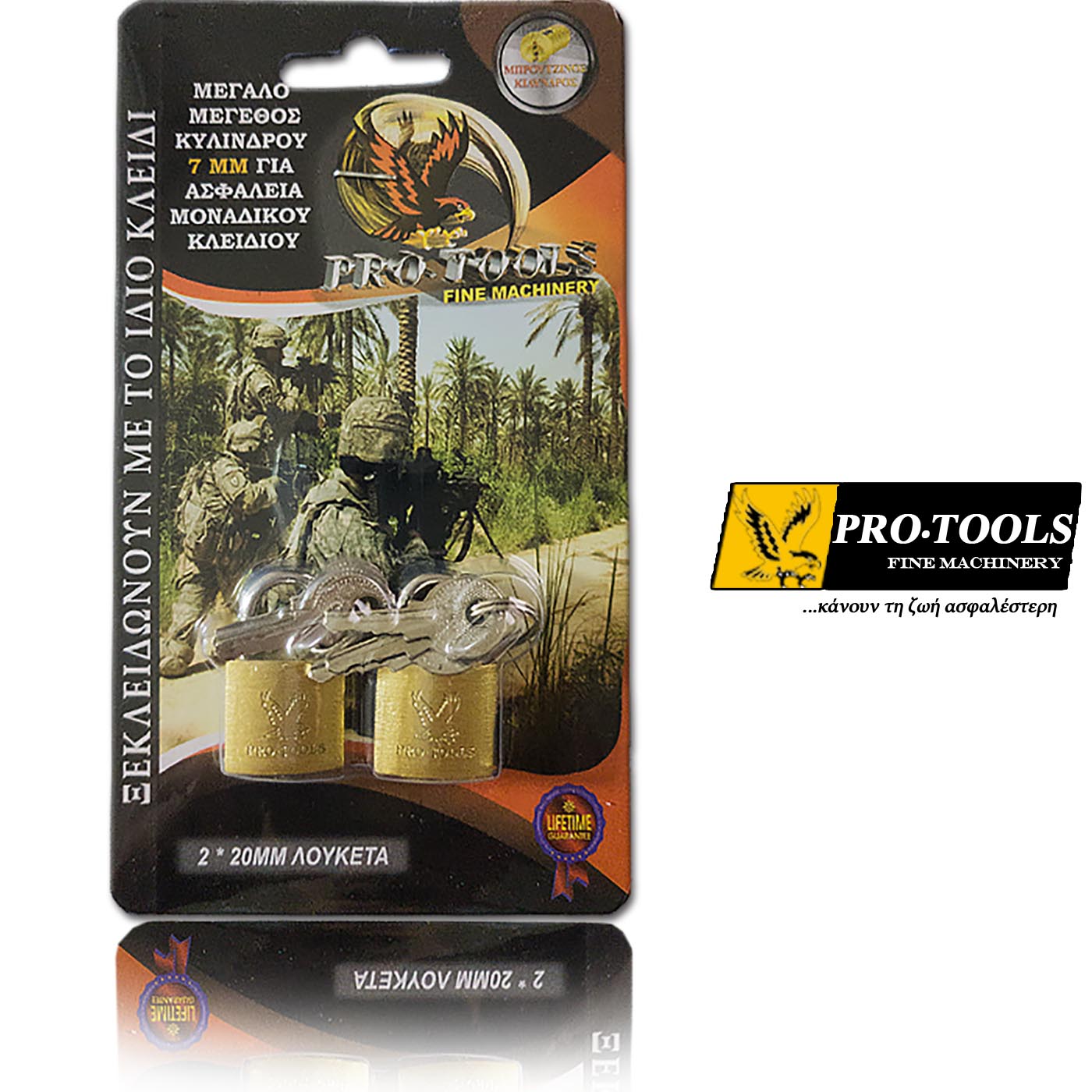 Λουκέτο με Μεγάλο Μέγεθος Κυλίνδρου Εξασφαλίζει 36 Διαφορετικούς Συνδυασμούς Κλειδιών Για Μέγιστη Αξιοπιστία Μοναδικού Κλειδιού, Ορειχάλκινα πινάκια μέσα σε ορειχάλκινο κύλινδρο και από τα λίγα με  επιμπρουτζομένα ελατήρια για προστασία από τη διάβρωση . Λουκέτο 20mmx2. (Σύστημα ΚΑ - Ανοίγουν με το ίδιο κλειδί) Pro-tools