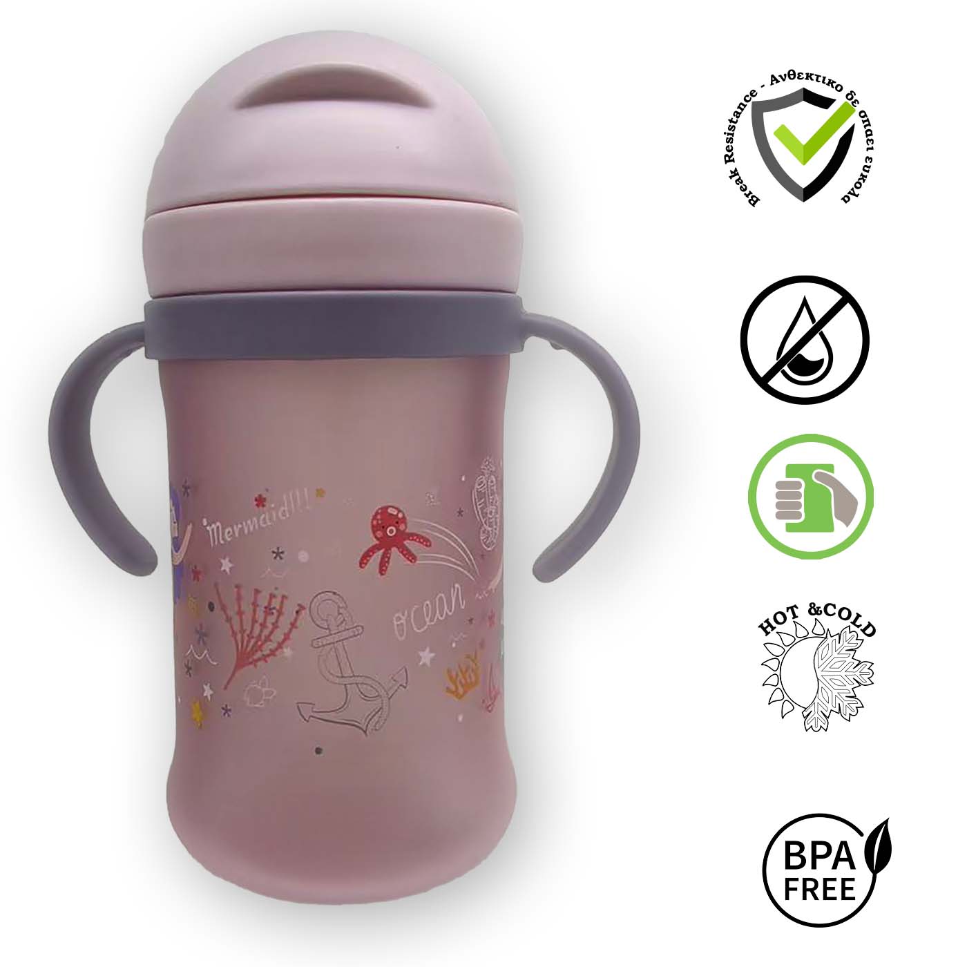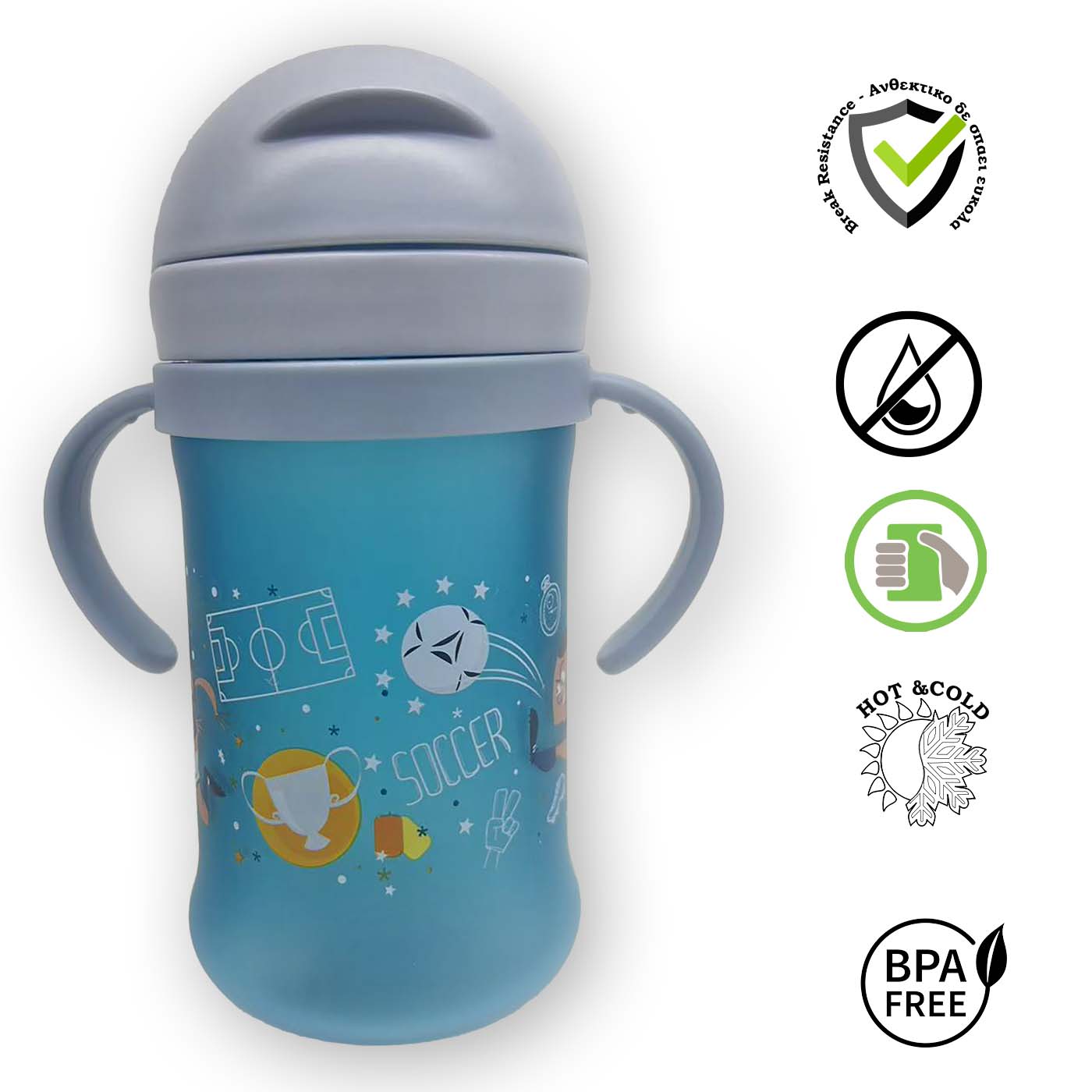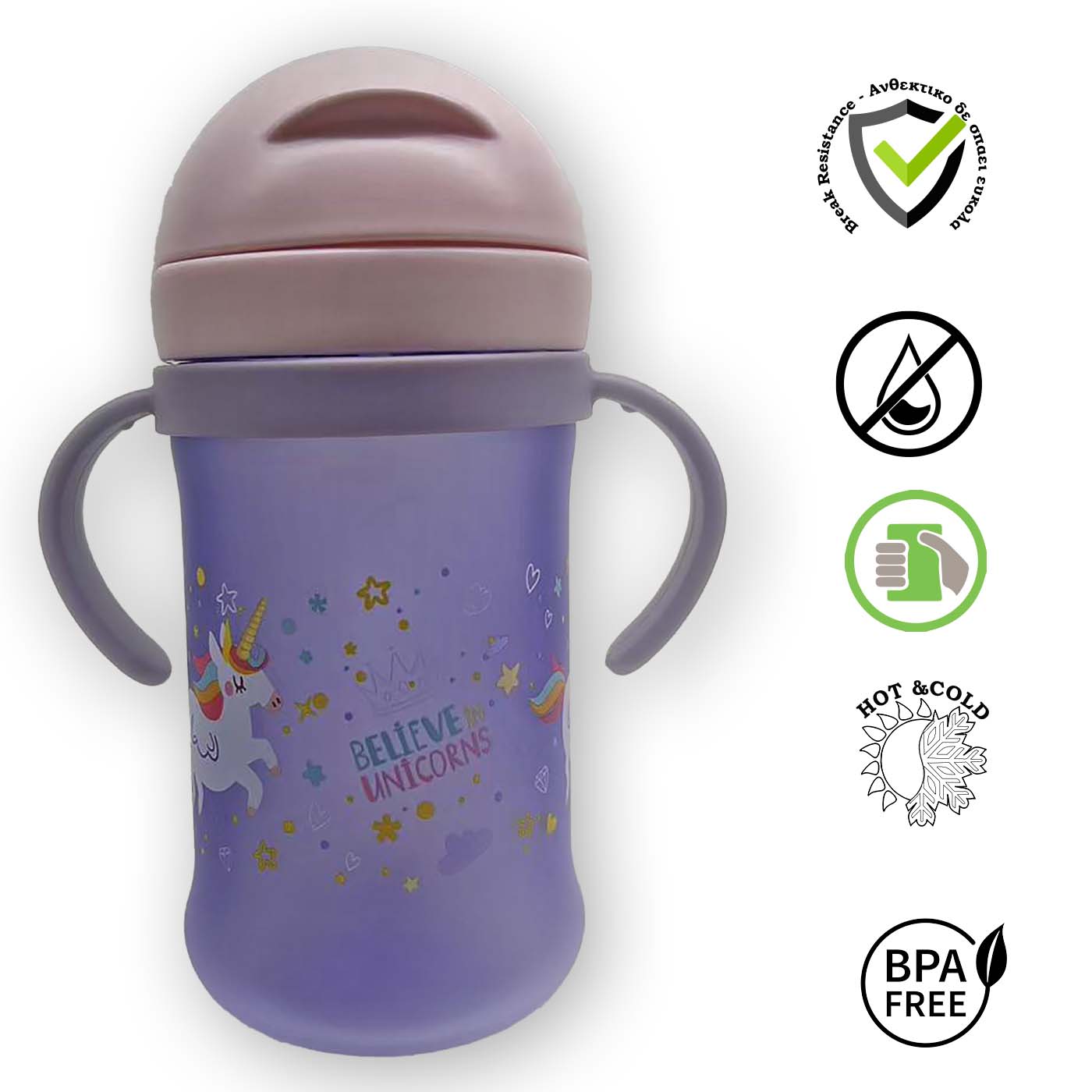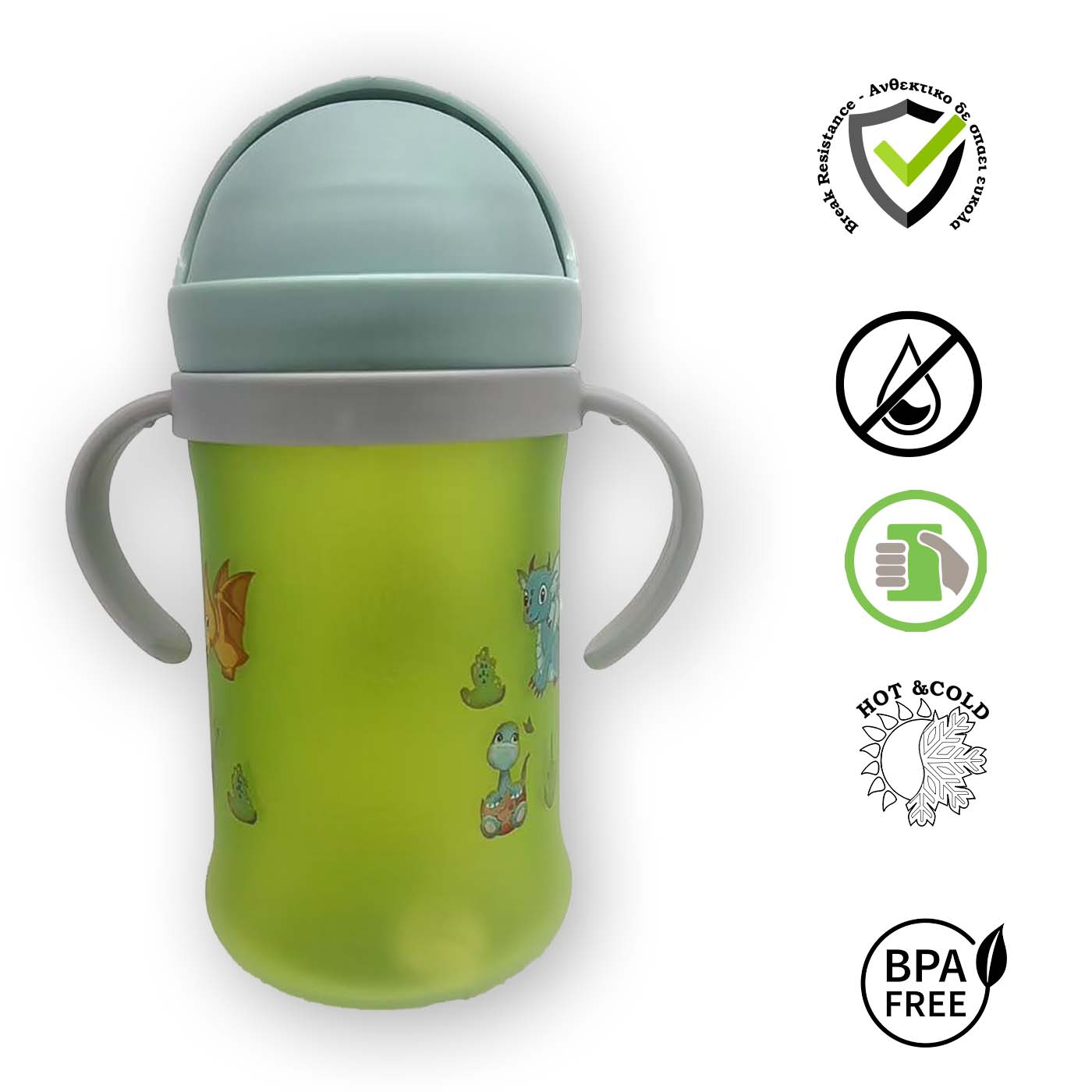 - Διαθέτει ένα ευλύγιστο νέου καλαμάκι από σιλικόνη. 1) εξασφαλίζει μηδέν διαρροές ακόμα και αν ανοίξει τυχαία ή από πτώση το προστατευτικό καπάκι. 2)Αρκετά πιο πλατύ και ανθεκτικό από τα συνηθισμένα καλαμάκια, εξασφαλίζει εύκολη και αβίαστη ροή νερού. (* διατίθενται ανταλλακτικά) 3) Σχεδιασμένο ώστε το καλαμάκι να φτάνει εύκολα στο υγρό και το παιδί σας να πίνει σε φυσική θέση