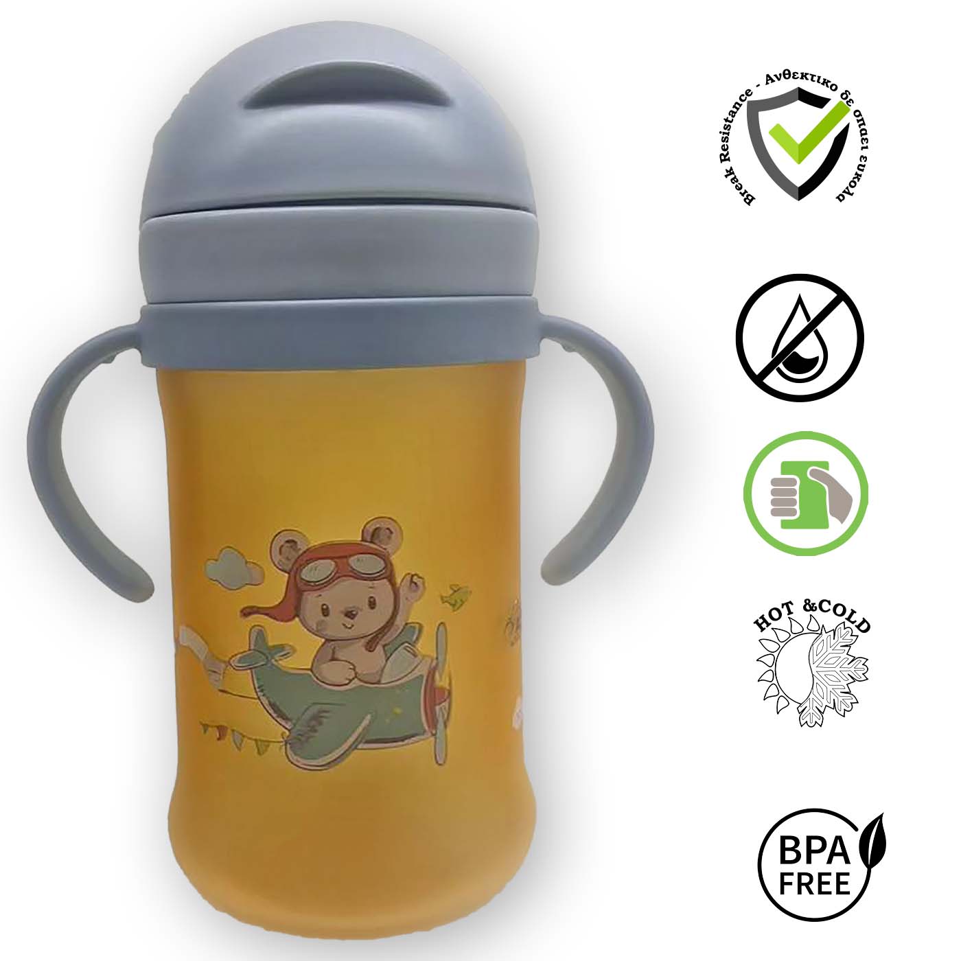 - Το καλαμάκι διαθέτει μια ενσωματωμένη βαλβίδα με προστασία από διαρροές. Το αρθρωτό καπάκι προστατεύει το καλαμάκι και αποτρέπει τυχόν διαρροές εν κινήσει. Ακόμα και να χτυπηθεί στα πεσίματα μπαίνει ευκολά στην θέση του χωρίς να χαλάσει. . (* διατίθενται ανταλλακτικά)