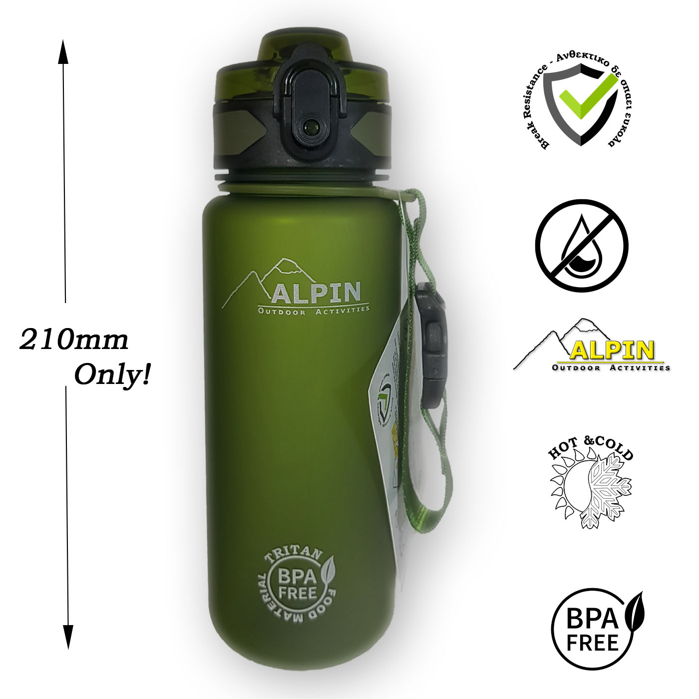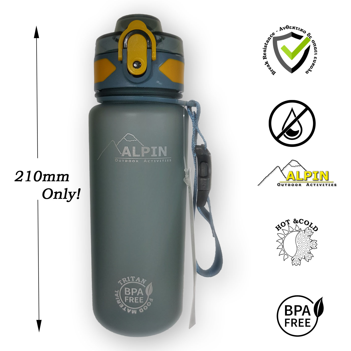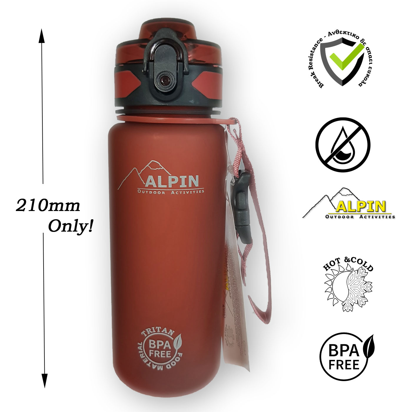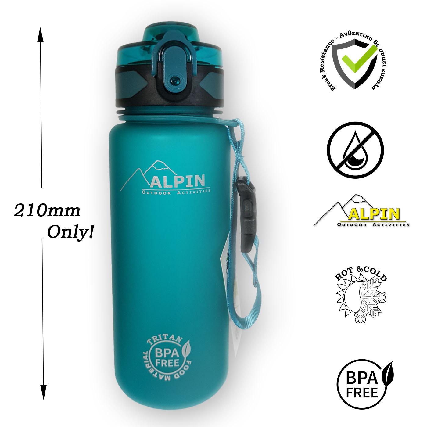 New design at 500ml without losing capacity. The Alpin bottle has a secure, leak-free lid with one-touch opening. It is ideal for the gym, for car cup holders, and an optimal choice for cycling. It is the ideal choice for small children since, despite its large capacity, it is compact and easy to transport and use. It is safe, non-toxic and fits in most bags and cup holders. |